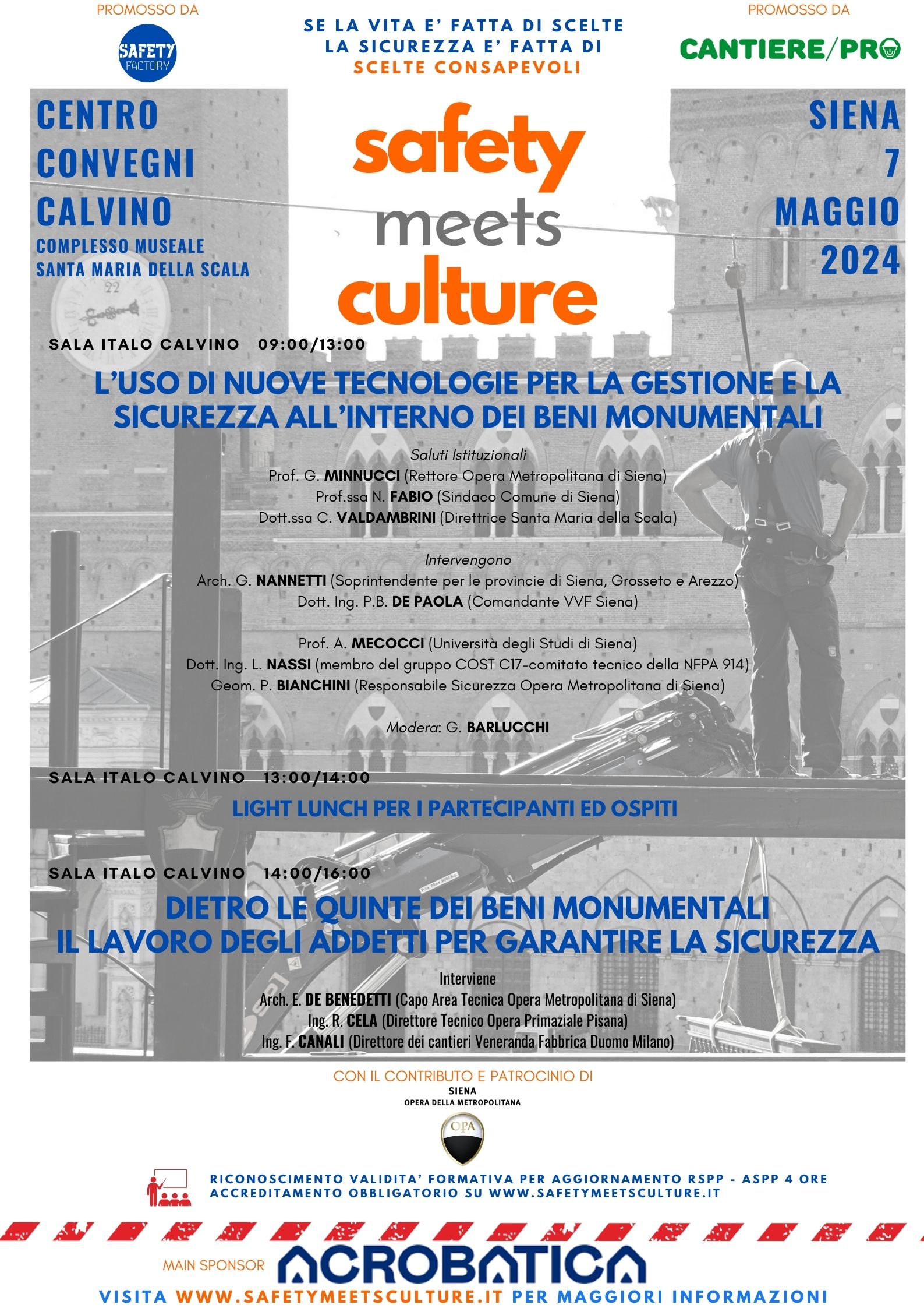 L’incontro, organizzato in collaborazione con CANTIERE/PRO all’interno del SAFETY MEETS CULTURE (7-9 maggio), si svolgerà il 7 maggio 2024 presso il Centro Convegni Calvino nel Complesso Museale del Santa Maria della Scala, piazza Duomo n°1, Siena.